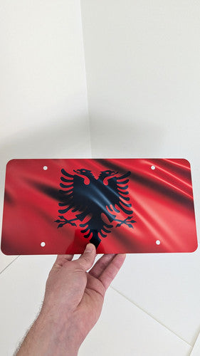 Placa de matrícula con bandera de Albania de 12 x 6 con cuatro orificios de montaje.